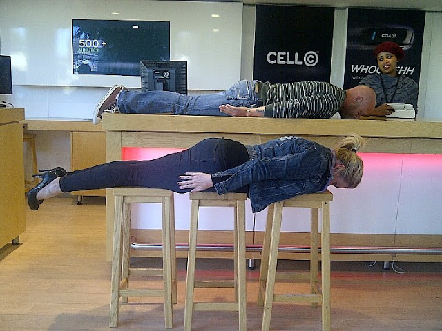 | We were running a competition with Cell C, so Mark and I headed off to a Cell Store and planked. |