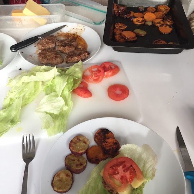 Once your burgers are cooked through and you either have roasted sweet potatoes or chips, serve them in a lettuce cup or on a bed of lettuce and tomato slices. Put a slice of cheese on and allow it melt, add your fried onions, bacon, avo or whatever topping you fancy.