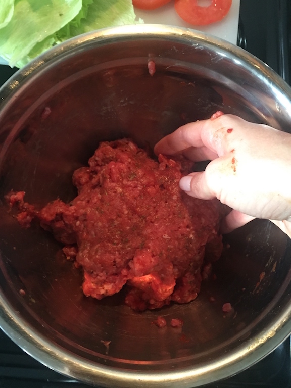 Section the mince mixture into little balls and then press between your hands to get a patty.