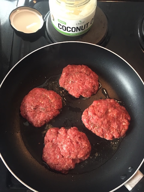 I fry them in a little coconut oil. Turn them every so often and brown them. If you want a well done burger patty keep them on longer, but if you like a medium patty, like I do… take them off a little earlier.