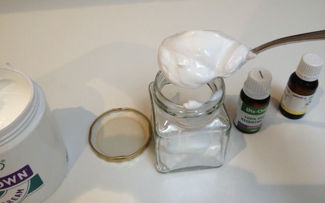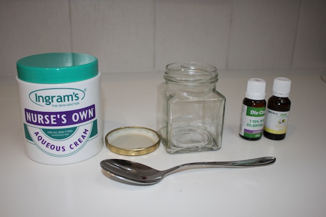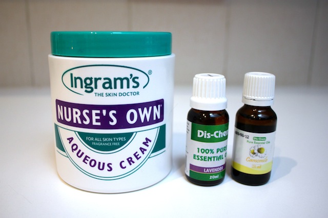 You need Aqueous Cream (non scented), Lavender essential oil and Chamomile essential oil and a glass jar or tub.