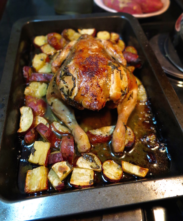The chicken meat is tender, soft and juicy, the skin crispy and the sweet potatoes crispy on the outside and soft in the inside. It’s pure perfection on a cold Winters night.