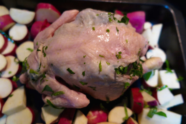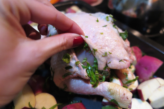 The chicken meat is tender, soft and juicy, the skin crispy and the sweet potatoes crispy on the outside and soft in the inside. It’s pure perfection on a cold Winters night.