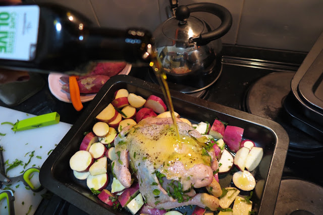 8. Pop into the oven and roast for about 50 minutes. After 25 minutes, open the oven and move the potatoes around to ensure they don’t stick and also that they don’t burn. Spoon some of the juices and oil over the skin of the chicken and pop back into the oven.