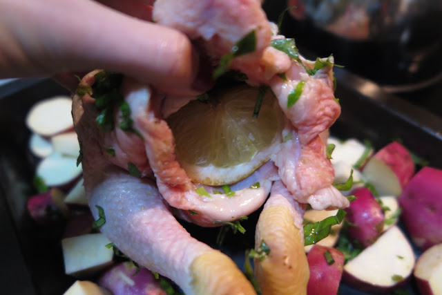 5. Cut the lemon in half and place it into the chicken cavity. The other half squeeze all over the chicken.