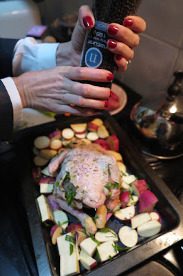 9. To ensure the chicken is cooked through, stick a knife in by the leg… clear juice should run out. It shouldn’t be pink. If it is pink, pop it back into the oven and monitor closely.