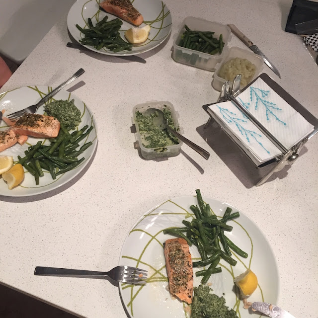 That evening we got the house ready for Gabriels birthday party and I quickly cooked some Salmon – a new recipe I learned from K and warmed up left over veggies.