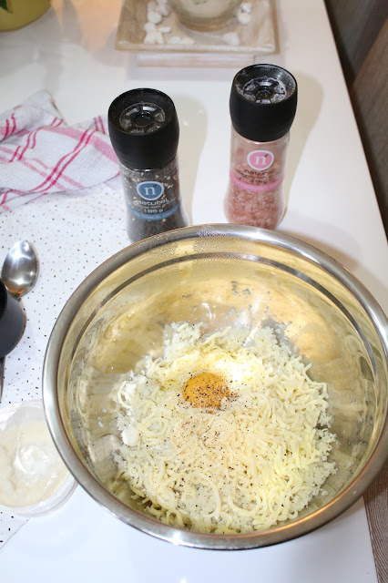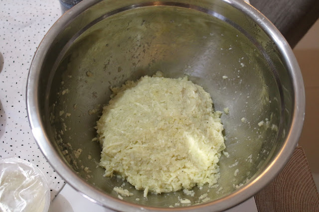 Once it’s cool to the touch, add your cheeses, egg and salt and pepper.