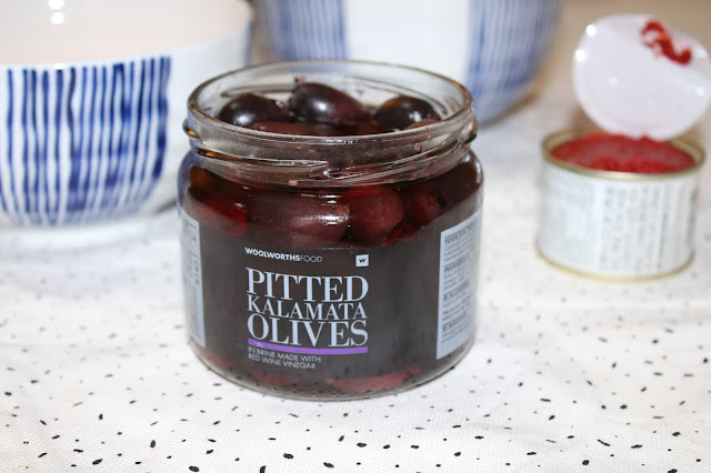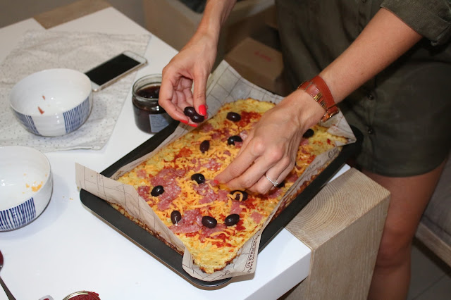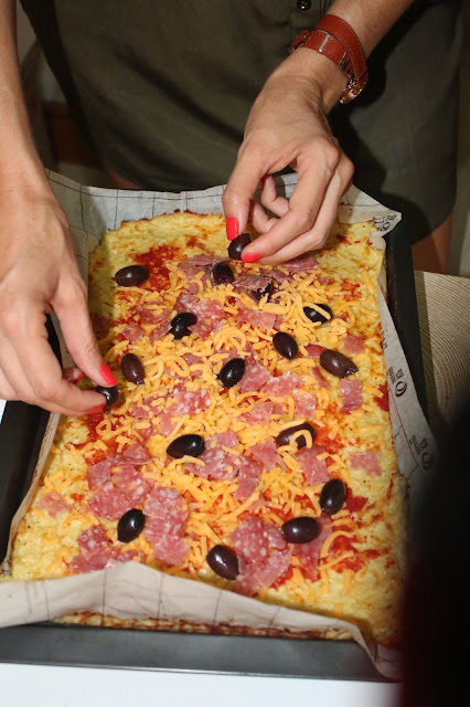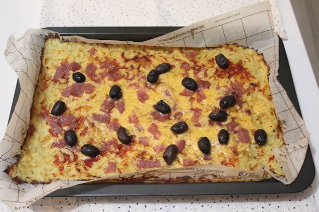 I smeared some tomato paste on, scattered salami, olives and cheese all over.