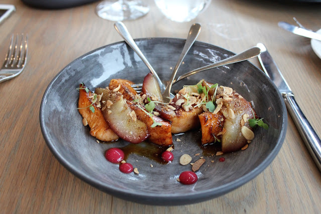 To start, I had the citrus-cured salmon, red wine poached pears, num-num gastrique and spiced almonds. It was incredible and I was sorry I finished it so quickly.