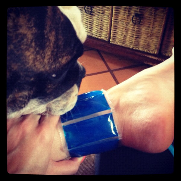 I hurt my Archilles heel in training and put an ice pack on. Duke rested his head on me and wouldn’t move until I removed it.