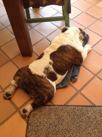 He’s a bit of a posh pup too. He can’t sleep unless he is resting on something. Today he dragged out a denim skirt (little sneak) so that he could lie on top of it. When he’s particularly hot, he lies like a spatchcock chicken. Hilarious.