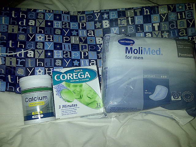 I bought him: Calcium tablets, solution to clean dentures and male adult nappies.