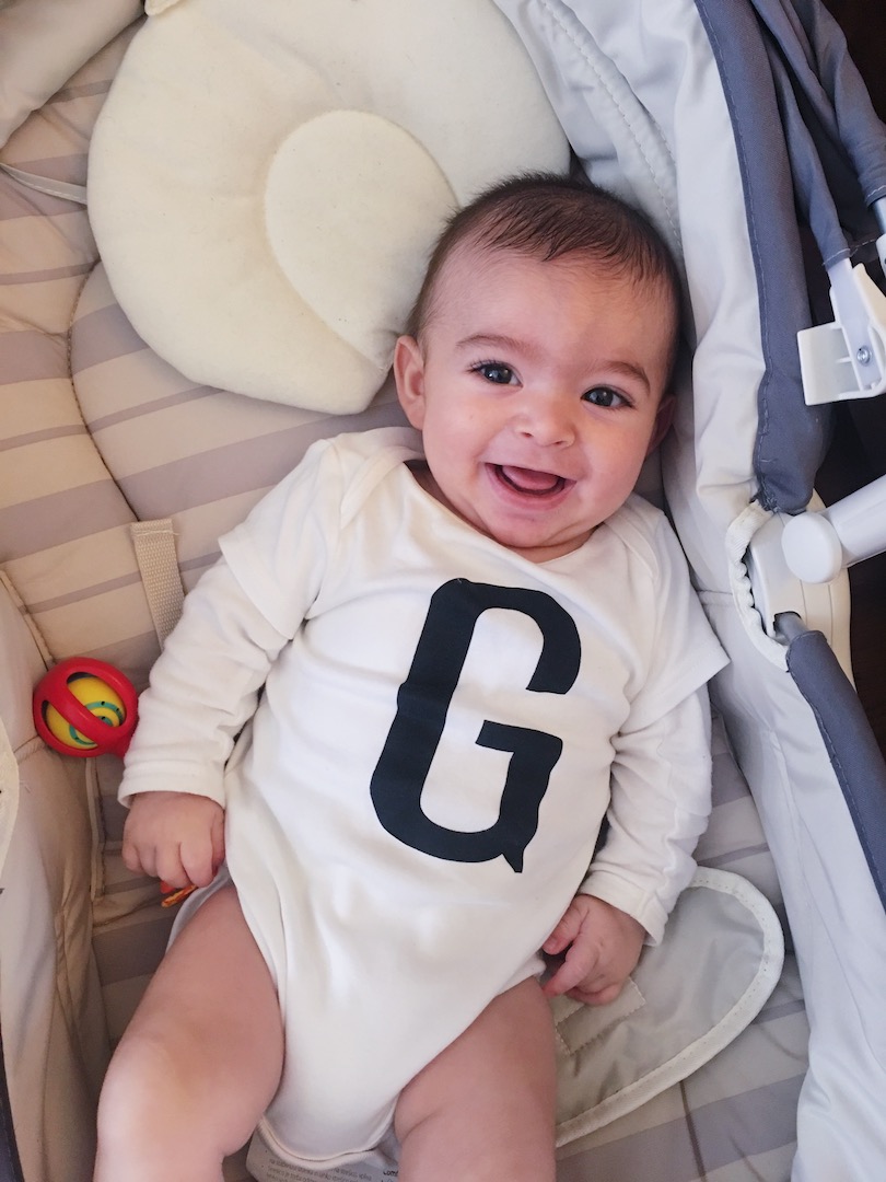 So much of Georgie reminds me of my own little boy when he was that young – the drooling for one! Mine wore a bib ALWAYS. Lol. And the tummy time face! Baby G is THE.CUTEST.EVER.