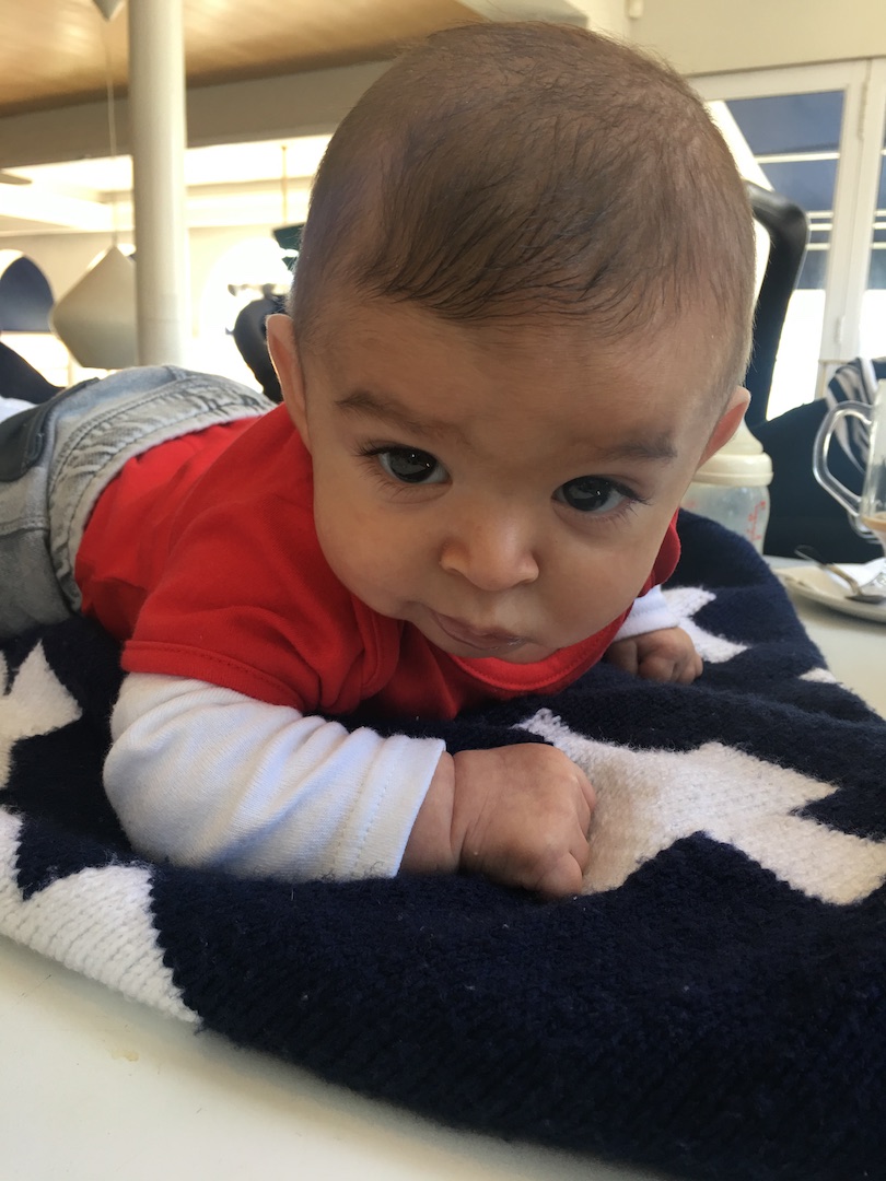 Georgie is getting bigger (and cuter) by the day. He is 19 weeks tomorrow (4 months) and time is flying! He’s drooling so much now that we can’t leave his bib off, or this happens…