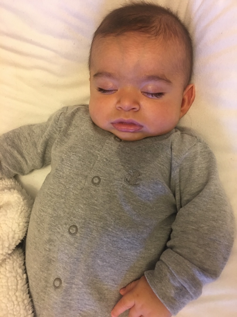 His eye colour is interesting… In photos they look brown. In person they’re still a dark blue and in the last 2 weeks his eyes have started going green, like Dads.