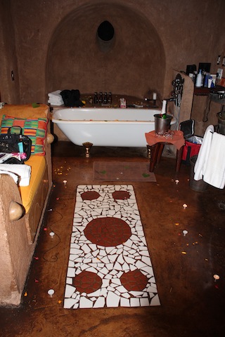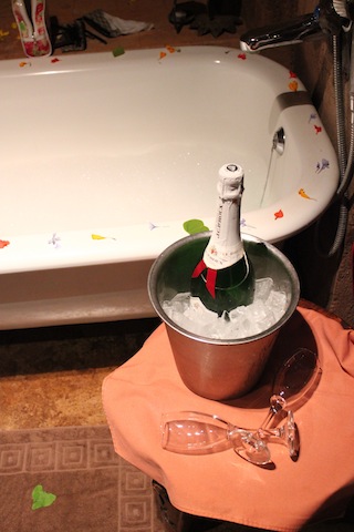 On Saturday night candles had been lit, flowers were placed around the bath and in a pattern on the bed and champagne was chilling on ice. My mom and I were so impressed and mom indulged in the hot bubbly water.