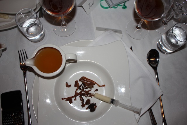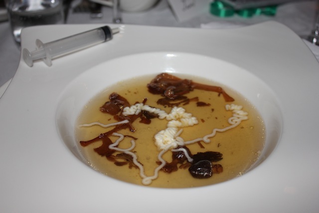 It was paired up with Chicken and Wild mushroom consomme… A plate of wild mushrooms arrived with a jug and syringe. We’re hardcore like that.