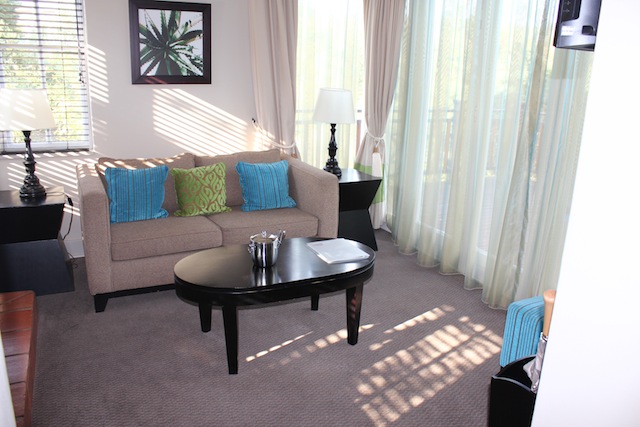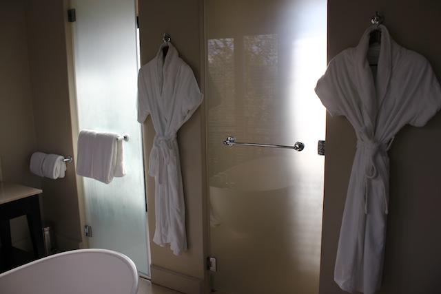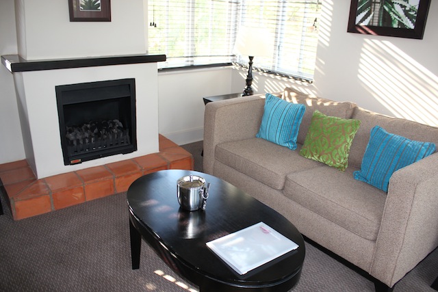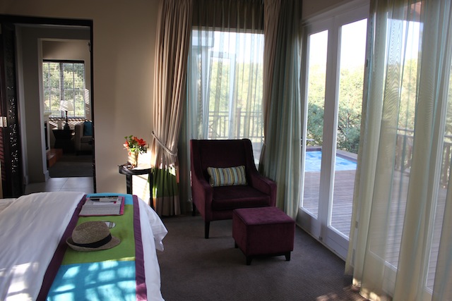 We had the rest of the afternoon for leisure, so we were taken by golf cart to our rooms. When I arrived at my room I walked in expecting a room… instead I walked into an “apartment.” I couldn’t stop saying “Wow!” and “Oh my gosh” and “Ooooh this is so stunning!” and yes, I was saying this out aloud… to myself. I walked into an entrance with tea and coffee set up, to the left my own lounge complete with fireplace and big flat screen TV and to my right, the bedroom. It had the biggest, most comfortable bed ever with another flat screen TV and the bathroom had a bath I want for my own home, a shower that can be an indoor or outdoor shower thanks to sliding doors and a deck with my own heated plunge pool. I felt like a rock star!