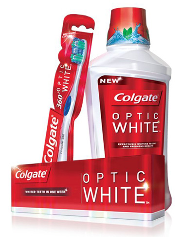 NEW Colgate® Optic White Mouthrinse effectively whitens teeth and freshens breath by reducing yellow stains to restore natural whiteness.